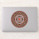 This mandala was designed for the zodiac sign, Aries, depicting a red jasper stone in the centre surrounded by elements representing the sign, such as the symbol for the sign, the constellation, and the alchemical symbol for Fire, as well as filigree vines and weaves wrapping it all into a solid image in shades of red, silver, and brown.