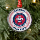 Show your state pride this holiday season with this unique Christmas ornament dedicated to Arizona, the 48th state. It has red, white, and blue patriotic colours with a circular typography design on a white background. The text includes facts about the state, such as its name, capital, state abbreviation, region, time zone, geographic coordinates, the year of its statehood, and its resident's name. It's a great gift for those who wish to celebrate their state or for those who are feeling nostalgic about their home state.
