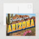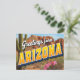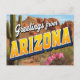 This vibrant, retro-style design perfectly captures the spirit of the Grand Canyon State. It features the bold "Greetings from Arizona" typography set against a classic Sonoran Desert scene, complete with a majestic Saguaro cactus, dramatic red rock formations in the background, and beautiful pink desert flowers in the foreground. Perfect for fans of vintage travel posters, retro artwork, and the stunning, unique scenery of the American Southwest. This is an ideal souvenir, travel memento, or gift for locals and visitors alike.