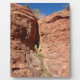 This red rock landscape is a view of a reddish rocky hillside in Northern Arizona. The stones of this part of the American Southwest get their ochre colour from the iron in the rocks, mixing with oxygen in air and water over the eons. Formed by erosion over long periods of time, these landscapes reveal beauty and interest in every crevice. Here we have desert plants and a bright blue sky above. A strong full sun shines down over the rocks in midday. Nature photography brings a beautiful addition to home decor.