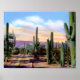 Vintage image of a desert scene somewhere in the Sonoran Desert in Arizona. Shown are saguaro cactus and dirt road leading to the mountains.