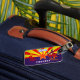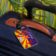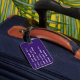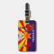 This customisable luggage tag inspired by the Arizona State flag in the background (red, yellow, and blue) features a cowboy riding a horse in the hot desert sun. Please replace the editable text with your own on both sides.