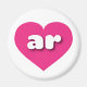 This magnet features a vibrant hot pink heart containing the bold, rounded, white lower case letters ar, a playful version of the abbreviation for Arkansas, the natural state.