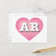This postcard features a calm, cool, and collected pink heart with a white-washed centre containing the bold, white, upper case letters AR, the official abbreviation for the state of Arkansas. The reverse side of the postcard is blank, awaiting your handwritten sentiments or customised text.