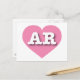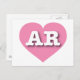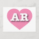 This postcard features a cool pink heart containing the bold, white, upper case letters AR, the official abbreviation for Arkansas, the natural state. The reverse side of the card is blank, awaiting your handwritten sentiments or customised text.