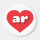 This magnet features a vibrant red heart containing the bold, white, rounded lower case letters ar, a playful abbreviation for Arkansas, the natural state.