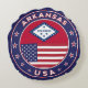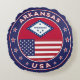 Badge of Arkansas with flag of Arkansas and flag of USA colours, rounded shape.