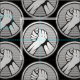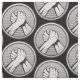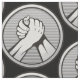 Silver round medal with two hands in arm wrestling. Custom background colour.
