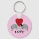 These cute key chains feature an armadillo couple under a heart looking over the word "Love" in a fun font on a light pink background.