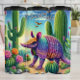 This is a fantasy-themed illustration of a multicolored armadillo walking through a lush cactus garden. The armadillo has a vibrant, rainbow-coloured shell and is surrounded by various blooming cacti with pink and orange flowers. The background is a bright desert landscape with a blue sky and birds flying overhead. The entire scene has a whimsical and serene aesthetic.