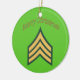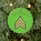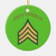 Army Sergeant Christmas Ornament. This ornament is decorated on one side with the Army Sergeant insignia and the words "Merry Christmas" and on the other with Santa Claus carrying a bag of goodies.