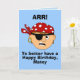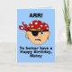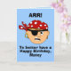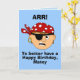 This cute pirate birthday card has a boy pirate with an eye patch, bandanna and scowl. The card says, "Arr! Ye better have a happy birthday, Matey." Inside reads, "Or I'll make ya walk the plank!"