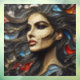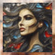 A portrait of a beautiful woman exuding arrogance in an abstract style. The stained glass technique employs artistic golden lines, blending red, orange, blue, and charcoal colours. Her hair cascades like waves in the ocean, adding a touch of vibrant elegance to this captivating portrayal of confidence.