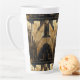 Pretty Latte Mug with a gold, brown and black Art Deco pattern that looks like tall skyscrapers in front of an abstract rising Sun. Very elegant, popular and stylish design for yourself or friends.