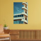 A blue sky behind an art deco building with a spiral stiarcase and lots of windows.