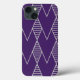 This phone case has an art deco design of diamonds in silver on a field of blue.