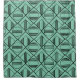 This shower curtain has an art deco design of diamonds inside diamonds with vertical lines and circles with horizontal lines on a field of turquoise.
