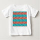 This baby t-shirt has an art deco design of two-toned orange and teal circles inside two-toned orange and teal triangles.