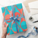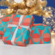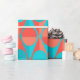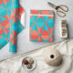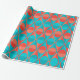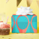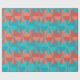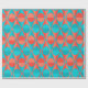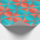 This wrapping paper has an art deco design of two-toned orange and teal circles inside two-toned orange and teal triangles.