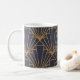 This mug has art deco design of diamonds and triangles in gold on a field of blue.