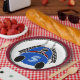 What Fun! Sure to delight both children & car racing fans, the design adorning this paper plate is an original digital painting by Leslie Sigal Javorek of a head-on view of a bright blue 1920’s Bugatti-inspired car and driver with chequered flags & tire marks trailing behind.