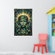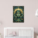 A mesmerizing blend of cubist form and Art Deco symmetry. This portrait features a stylized woman's face composed of geometric teal and black planes, framed by a radiant, celestial gold sunburst. The composition is anchored by intricate botanical and chevron patterns, making it a sophisticated statement piece for a modern gallery wall, upscale office, or luxury lounge.