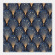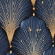This Art Deco–inspired pattern features elegant fan motifs arranged in a repeating scalloped layout, creating a sense of rhythm and luxury. Deep navy blue forms the base of each fan, while fine gold lines radiate outward like stylized ginkgo leaves, adding dimension and movement. Soft metallic accents and scattered golden dots enhance the richness of the design, giving it a glamorous, vintage-modern feel. The combination of dark, moody tones and luminous gold evokes classic 1920s opulence with a contemporary edge.