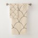 Bath towel set, consisting of a face cloth, hand towel and bath towel with an art deco design. You can customise this bath towel set with any text of your choice. Should you require any help with customising then contact us through the message link on this page. Art deco design bathroom towel set