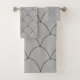 Bath towel set, consisting of a face cloth, hand towel and bath towel with an art deco design. You can customise this bath towel set with any text of your choice. Should you require any help with customising then contact us through the message link on this page. Art deco design bathroom towel set