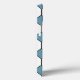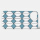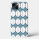 This phone case has an art deco design of white hexagons with a black line down the middle and blue diamonds.