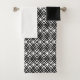 This towel set has a black washcloth, a white hand towel, and a bath towel with an art deco design of overlapping diamonds in black on a field of white.