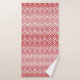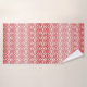 This towel set has red washcloth, a pink hand towel, and a bath towel with an art deco design of overlapping diamonds in ombre effect of red on a field of white.