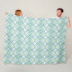 This large fleece blanket has an art deco design of overlapping diamonds in verditer (green) and blue on a field of white.