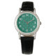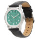 This watch has an art deco design of diamonds with vertical and diagonal lines and circles on a field of retro blue green.