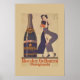 Beautiful Art Deco advertising poster for champagne in tones of blues and browns. Featuring a giant bottle of bubbly being admired by two lovely ladies dressed in Art Deco frocks.