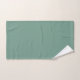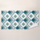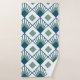 This towel set has an art deco design of teal diamonds with diagonal lines and seafoam green diamonds on a field of white.