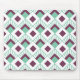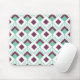 This mouse pad has an art deco design of seafoam green diamonds with diagonal lines and eggplant diamonds on a field of white.