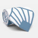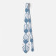 This necktie has an art deco design of dusty blue diamonds with diagonal lines and dark blue diamonds on a field of white.