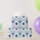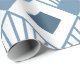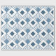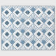 This wrapping paper has an art deco design of dusty blue diamonds with diagonal lines and dark blue diamonds on a field of white.