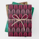 Wrapping paper in a vintage Art Deco wallpaper pattern based on a stylised feather - deep fuchsia pink and soft pink, on a black background, aqua and turquoise / peacock, on a deep teal background, and rust brown and light chamois yellow, on a dark chocolate brown background