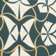 This artwork features an intricate pattern inspired by Art Deco design, chraacterised by flowing, symmetrical lines and geometric shapes. The design is rendered in a refined palette of deep teal, cream, and subtle gold accents, creating a sophisticated and elegant look. The repeating motifs form a complex, interwoven pattern that exudes both harmony and movement. The combination of curves and sharp angles adds a dynamic quality to the design, while the colour scheme maintains a sense of timelessness and classic style.