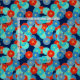 An Art Deco pattern based on a traditional, stylised chrysanthemum pattern used in Japanese textiles, in shades of blue, turquoise and bright red, outlined in gold, on a dark blue background