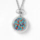 An Art Deco pattern based on a traditional, stylised chrysanthemum pattern used in Japanese textiles, in shades of blue, turquoise and bright red, outlined in gold, on a dark blue background