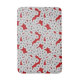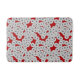 An Art Deco pattern bath mat based on a traditional, stylised chrysanthemum pattern used in Japanese textiles, in creamy white outlined in grey with a rich, Chinese red background