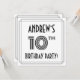 The front of this elegant and 1920s-1930s style inspired tenth birthday celebration invitation card design features a customisable name, an intricate art deco style inspired number “10th”, the message “BIRTHDAY PARTY!”, and a border pattern consisting of lines. The back features personalised details about the event, such as the date, time, venue/location, and any other information that may be important. Stylish, elegant, customised invitations like these might be used to invite guests to a birthday party/gathering being held to celebrate somebody’s 10th birthday. [~Z0000614]
