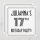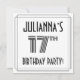 The front of this elegant seventeenth birthday celebration/party invitation card design features a custom name, a fancy art deco look inspired number “17th”, the message “BIRTHDAY PARTY!”, and a border pattern consisting of lines. The back features personalised details about the event, such as the date, time, place, and any other information that may be useful. Luxurious, elegant, editable invitations like these might be used to invite attendees to a birthday gathering being held to honour somebody’s 17th birthday. [~Z0000614]