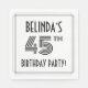 This stylish forty-fifth birthday celebration/party paper napkin design features a personalised name, a fancy art deco look inspired number “45th”, the message “BIRTHDAY PARTY!”, and a border pattern consisting of lines. Elegant birthday themed paper napkins like these might be used at a party in celebration of somebody’s forty fifth birthday. [~Z0000613]