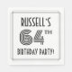 This 1920s-1930s style inspired sixty-fourth birthday party paper napkin design features a customisable name, a fancy art deco style inspired number “64th”, the message “BIRTHDAY PARTY!”, and a border pattern consisting of lines. Paper napkins like these might be used at a birthday party for somebody who is celebrating their sixty fourth birthday. [~Z0000613]