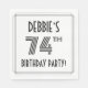 This luxurious and Roaring Twenties inspired seventy-fourth birthday celebration paper napkin design features a personalised name, an intricate art deco style inspired number “74th”, the message “BIRTHDAY PARTY!”, and a multi-line border. Birthday themed paper napkins like these might be used at a party celebrating somebody’s seventy fourth birthday. [~Z0000613]