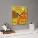 This personalised square wall clock has a vintage Art Deco stencil look. A woman in an orange dress sits at a writing desk with pen raised while a lamp shines next to her. The background is dark gold. The woman looks like she is from the 19th or early 20th century. The design has a modern stylised feel.